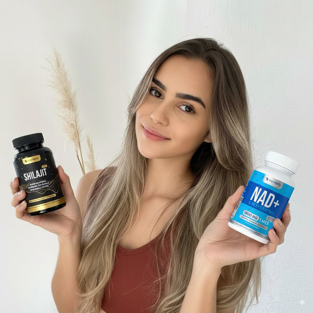 Una sinergia poderosa de NAD+ & Resveratrol y Shilajit para potenciar tu rendimiento diario y bienestar integral.