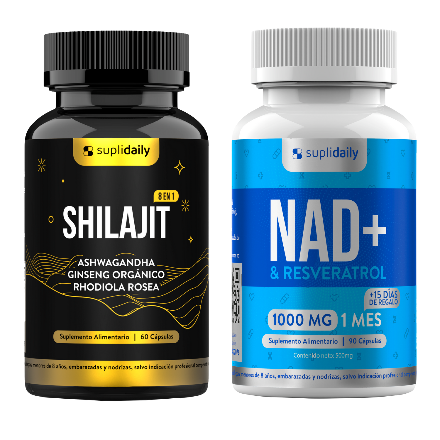 Cada producto ofrece beneficios individuales valiosos. Sin embargo, el Dúo Energía está diseñado para una sinergia avanzada. Mientras el NAD+ & Resveratrol apoya tu energía celular, el Shilajit potencia la absorción y resistencia. Juntos, maximizan los resultados para un bienestar más integral y sostenido.